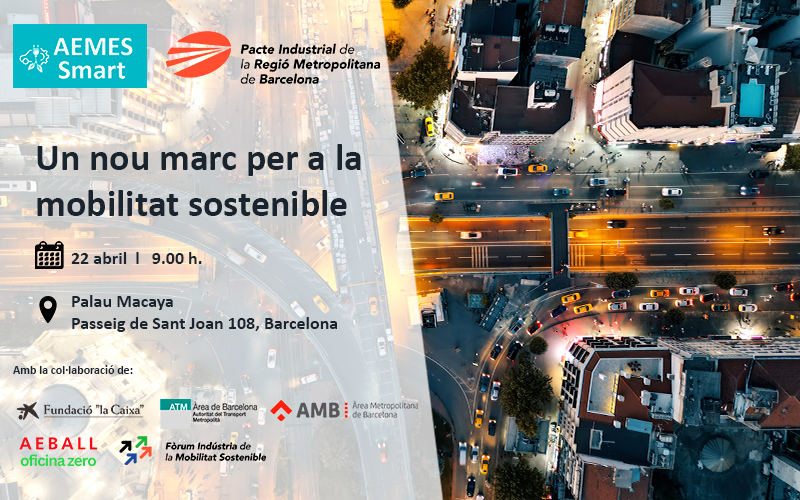 El proper 22 d'abril es celebrarà a l'Auditori del Palau Macaya la jornada "Un nou marc per a la mobilitat sostenible" de la mà d'AEMES Smart i el Pacte Industrial de la Regió Metropolitana de Barcelona. L'acte -que compta amb el suport de La Fundació "la Caixa", l'ATM, l'AMB, l’Oficina Zero d’AEBALL i el Fòrum Indústria de la Mobilitat Sostenible del Pacte Industrial-, pretén explorar el nou marc de la mobilitat sostenible, centrada en l’impacte de la nova llei i en el paper clau de les estratègies col·laboratives per reforçar la competitivitat empresarial i territorial.